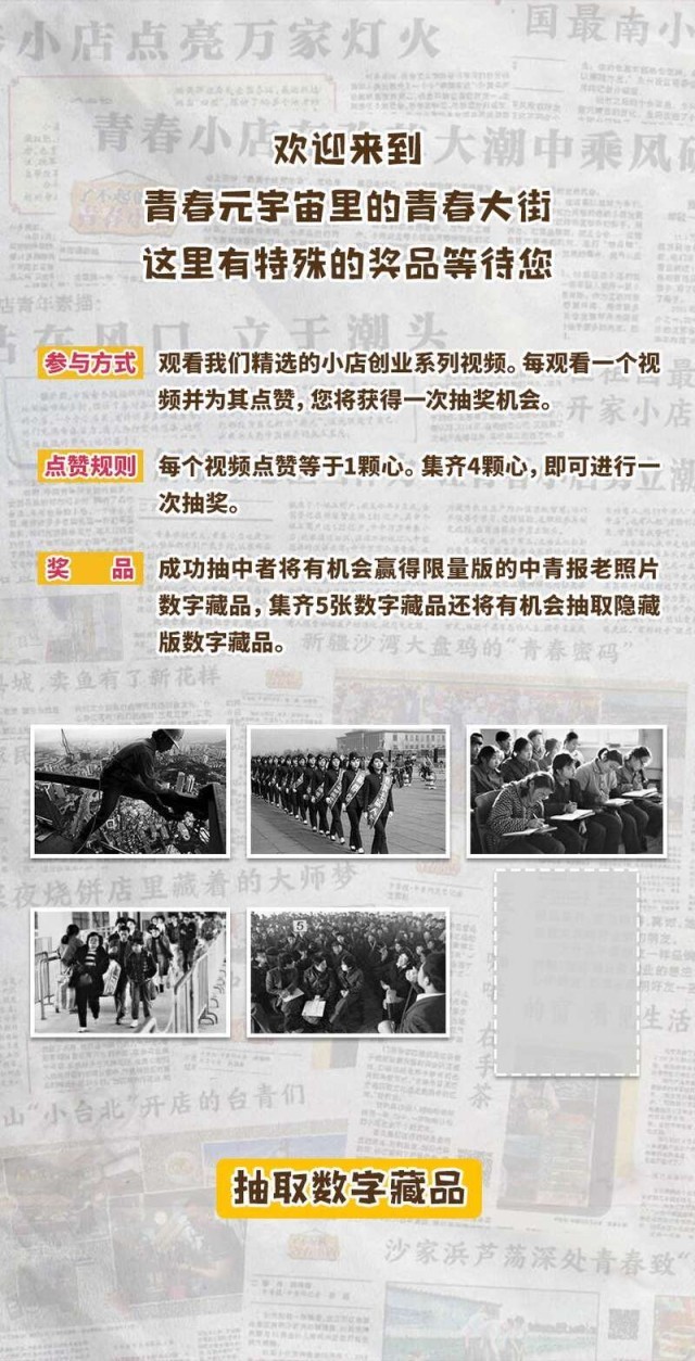 奔跑在青春大街上的青小豹邀请读者一起玩寻找小店的游戏,大家可以边体验边观看一个个小店和店主的故事,参加爱心点赞,还可以参与抽奖。奖品是用区块链技术创制的数字藏品——改革开放45年以来中国青年报拍摄的精彩照片。