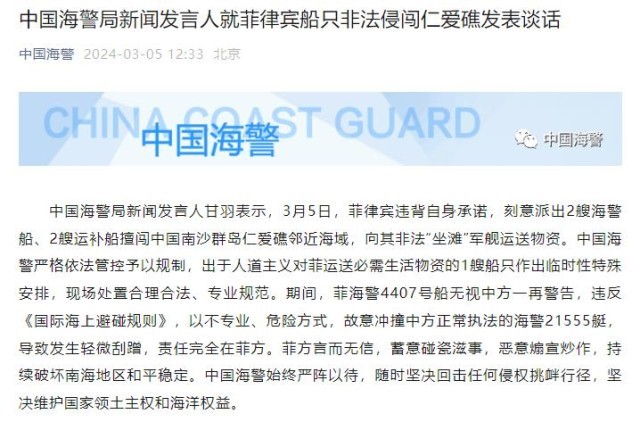 央视网消息:中国海警局新闻发言人甘羽表示,3月5日,菲律宾违背自身承诺,刻意派出2艘海警船、2艘运补船擅闯中国南沙群岛仁爱礁邻近海域,向其非法“坐滩”军舰运送物资。中国海警严格依法管控予以规制,出于人道主义对菲运送必需生活物资的1艘船只作出临时性特殊安排,现场处置合理合法、专业规范。期间,菲海警4407号船无视中方一再警告,违反《国际海上避碰规则》,以不专业、危险方式,故意冲撞中方正常执法的海警21555艇,导致发生轻微刮蹭,责任完全在菲方。菲方言而无信,蓄意碰瓷滋事,恶意煽宣炒作,持续破坏南海地区和平稳定。中国海警始终严阵以待,随时坚决回击任何侵权挑衅行径,坚决维护国家领土主权和海洋权益。