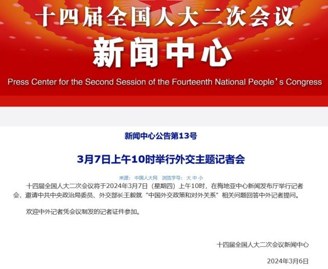 十四届全国人大二次会议将于2024年3月7日(星期四)上午10时,在梅地亚中心新闻发布厅举行记者会,邀请中共中央政治局委员、外交部长王毅就“中国外交政策和对外关系”相关问题回答中外记者提问。