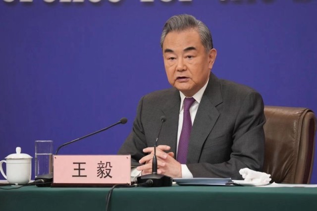 3月7日上午,十四届全国人大二次会议举行记者会,中共中央政治局委员、外交部部长王毅回应南海问题。中青报·中青网记者 李隽辉/摄