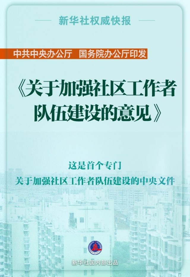 中共中央办公厅、国务院办公厅近日印发《关于加强社区工作者队伍建设的意见》,这是第一个专门关于加强社区工作者队伍建设的中央文件,对于打造一支政治坚定、素质优良、敬业奉献、结构合理、群众满意的社区工作者队伍,不断壮大城市基层治理骨干力量具有重要意义。