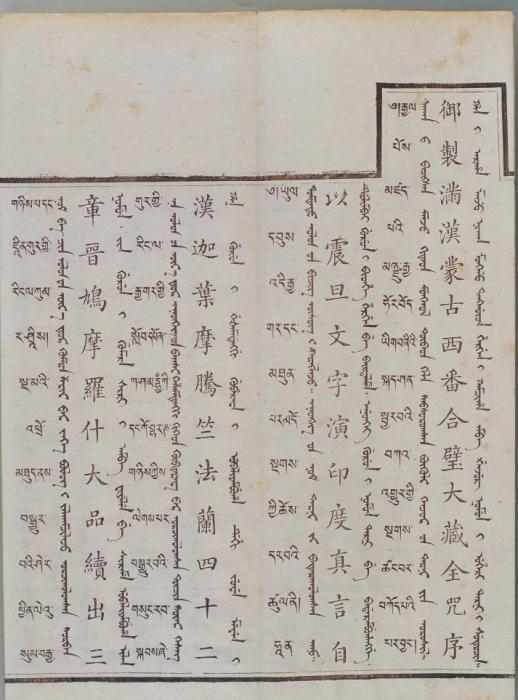 康熙皇帝特别注重刊行蒙古文《甘珠尔》以“利于祭诵”,康熙五十六年(1717年)下令刊刻蒙古文《甘珠尔》。到了乾隆三十二年(1767年),傅恒上书提出,要让僧人念经念得准,需要标明原音、辅音的韵脚和切音,最好能看着汉字就能念出梵音(“礼今教习僧人持念咒语止,须明晓阿礼嘎礼音韵反切,自能对汉字而得梵音”)。于是,为方便蒙古地区僧人念诵咒语,《御制满汉西番合璧大藏全咒》添译了蒙古文。蒙古文《大藏经》是蒙古族历史文化发展的里程碑,也是蒙古族已知最大部头的古籍。在译经过程中,蒙古文字也得到了充分锤炼与发展,提高了交流与表现能力。