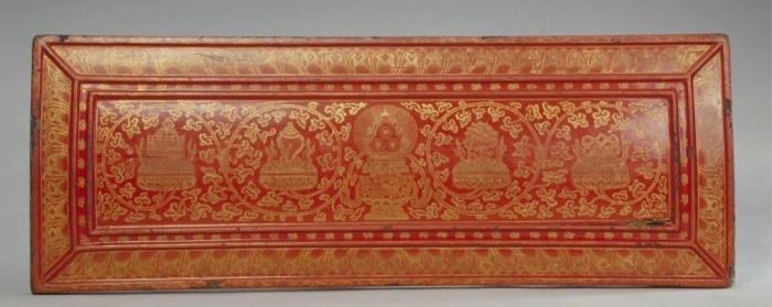 ▲永乐版藏文《大藏经》之红漆戗金八吉祥纹经文夹板(图片来源:故宫博物院官网)