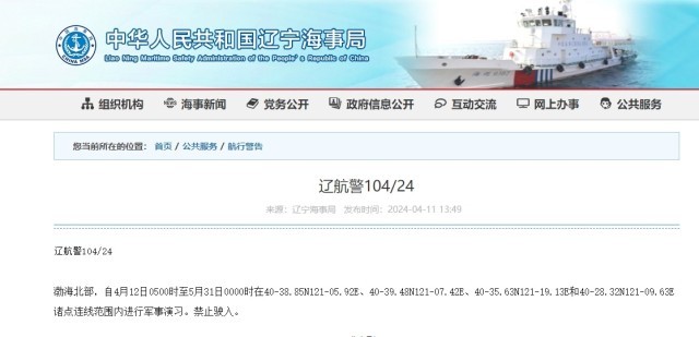 辽宁海事局发布航行警告,4月12日5时至5月31日0时,渤海部分海域将进行军事演习。禁止驶入。