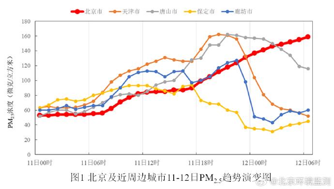 显著不利气象条件造成京津冀区域污染水平快速上升,形成区域性污染,11日白天北京近周边石家庄、保定、天津等城市PM2.5快速上升,以3-4级轻中度污染水平为主,部分站点达到4-5级中重度污染;入夜后近周边城市PM2.5污染显著加重,天津唐山等城市达到5级重度污染水平,北京PM2.5浓度持续上升,尤其是11日夜间 PM2.5快速上升,12日凌晨至上午达到4-5级中重度污染水平。