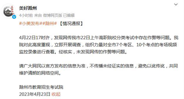 中新网4月23日电 据安徽省滁州市委宣传部官方微博消息,滁州市教育招生考试院23日发布情况通报。通报称,4月22日17时许,发现网传滁州市22日上午高职院校分类考试中存在作弊等问题。