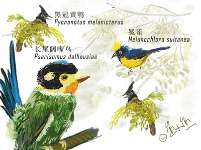 长尾阔嘴鸟、黑冠黄鹎、冕雀,参赛队员用漫画展示在弄岗观鸟的收获。