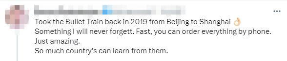 还有网友说,“2019年坐高铁从北京到上海。一些事我永远不会忘记。速度很快。太棒了。很多国家可以向他们学习。”