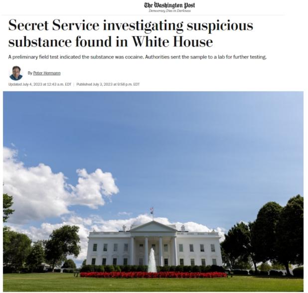 中新网7月4日电 据美国《华盛顿邮报》4日报道,当地时间2日晚,美国特勤局在白宫内发现了一些可疑白色粉末状物质,经初步鉴定,其中含有可卡因成分。