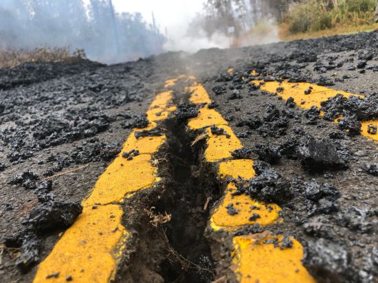 2018年5月9日,在美国夏威夷帕霍阿镇附近的“莉拉妮地产”居民区,火山活动造成地面出现裂缝。新华社记者陶希夷摄