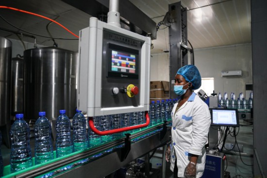 9月9日,当地员工在位于加蓬首都利伯维尔的欧来源纯净水厂生产线上工作。新华社记者韩旭摄