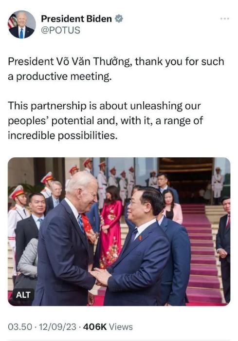 在这条发布在美国总统官方账号上的帖子里,拜登为“富有成效的会议”向武文赏(Vo Van Thuong)表示感谢。然而,配发的图片中并没有出现武文赏,而是放了拜登和越南国会主席王庭惠(Vuong Dinh Hue)握手的照片。这条帖子目前已被删除。