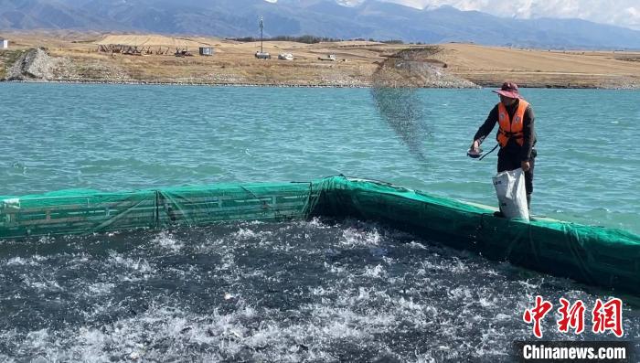 9月9日,记者来到位于新疆伊犁尼勒克县喀拉苏乡的三文鱼养殖基地。图为养殖工向网箱中的虹鳟鱼抛撒饵料。中新社记者 朱贺 摄