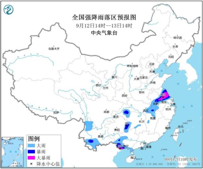 预计,9月12日14时至13日14时,江苏中部、安徽中部、湖北东南部和西南部、江西北部、湖南西部、贵州东南部、云南西北部和南部、广西西部和南部等地部分地区有大到暴雨,其中,江苏中部、安徽中部偏东地区、广西南部等地部分地区有大暴雨(100~160毫米);上述地区最大小时降雨量30~50毫米,局地可超过60毫米,局地还有雷暴大风等强对流天气。