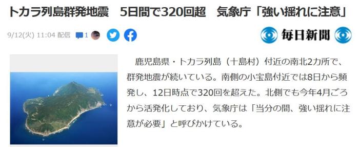 9月8日至12日,日本鹿儿岛县吐噶喇群岛持续发生地震,5天内地震超320次。图片来源:日本《每日新闻》报道截图