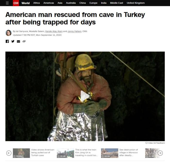 中新网9月12日电 综合外媒报道,当地时间12日凌晨,被困在土耳其一处地下洞穴1000多米深处多日的美国洞穴探险家马克·迪基,被成功救出。