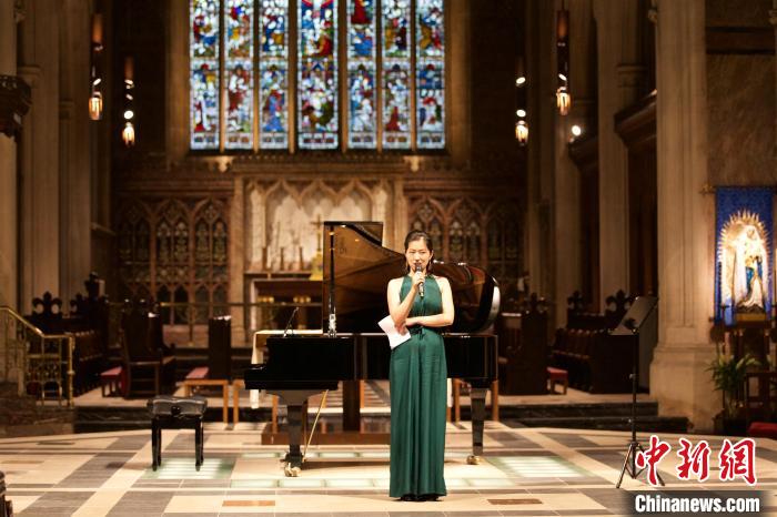 9月上旬,“东风”系列三音乐会在伦敦举办,来自不同国家和地区的9位杰出歌唱家分别用中文为100多位观众献上了20首诗词及民族民间艺术歌曲。图为活动主办者、旅英青年歌唱家钱亦萱主持音乐会。 Lexie Lin 摄