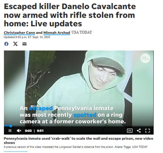 中新网9月13日电 综合美媒报道,当地时间12日,美国宾夕法尼亚警方表示,在该州东南部发现了13天前越狱的杀人犯达内洛·卡瓦尔坎特,他从一户民宅获取了一支步枪。目前警方已设立新的包围圈逼近该逃犯。