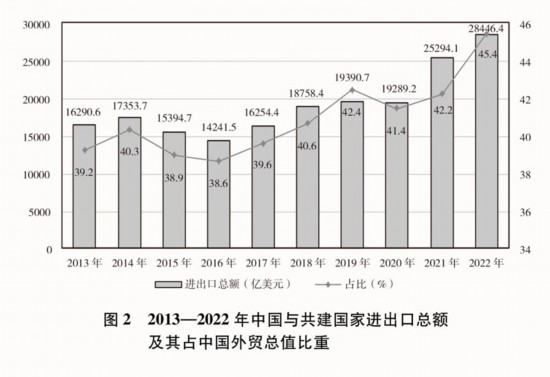 贸易投资规模稳步扩大。2013-2022年,中国与共建国家进出口总额累计19.1万亿美元,年均增长6.4%;与共建国家双向投资累计超过3800亿美元,其中中国对外直接投资超过2400亿美元;中国在共建国家承包工程新签合同额、完成营业额累计分别达到2万亿美元、1.3万亿美元。2022年,中国与共建国家进出口总额近2.9万亿美元,占同期中国外贸总值的45.4%,较2013年提高了6.2个百分点;中国民营企业对共建国家进出口总额超过1.5万亿美元,占同期中国与共建国家进出口总额的53.7%。