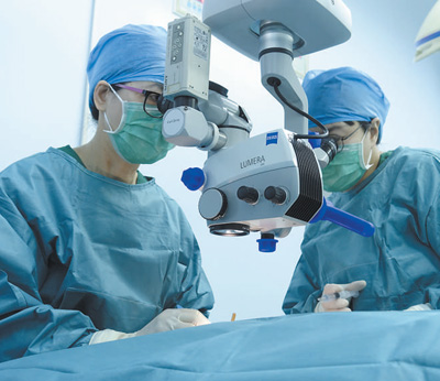9月16日,北京大学人民医院“健康快车国际光明行”医疗队医生鲍永珍(左)和孟庆娱正在为吉尔吉斯斯坦患者实施白内障复明手术。