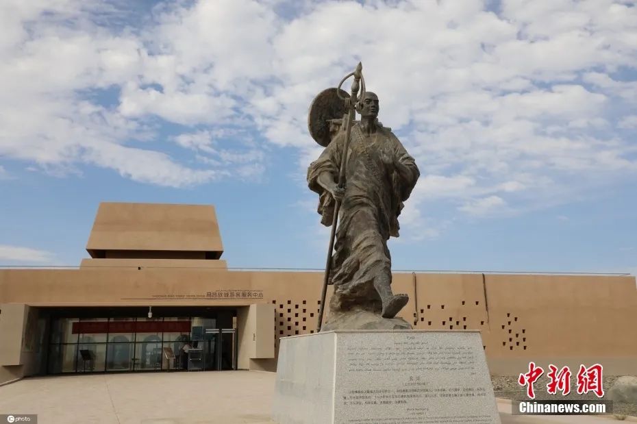 资料图:位于新疆维吾尔自治区的高昌故城前,现陈列有唐代高僧玄奘的塑像,玄奘西行求法时曾途经此地。