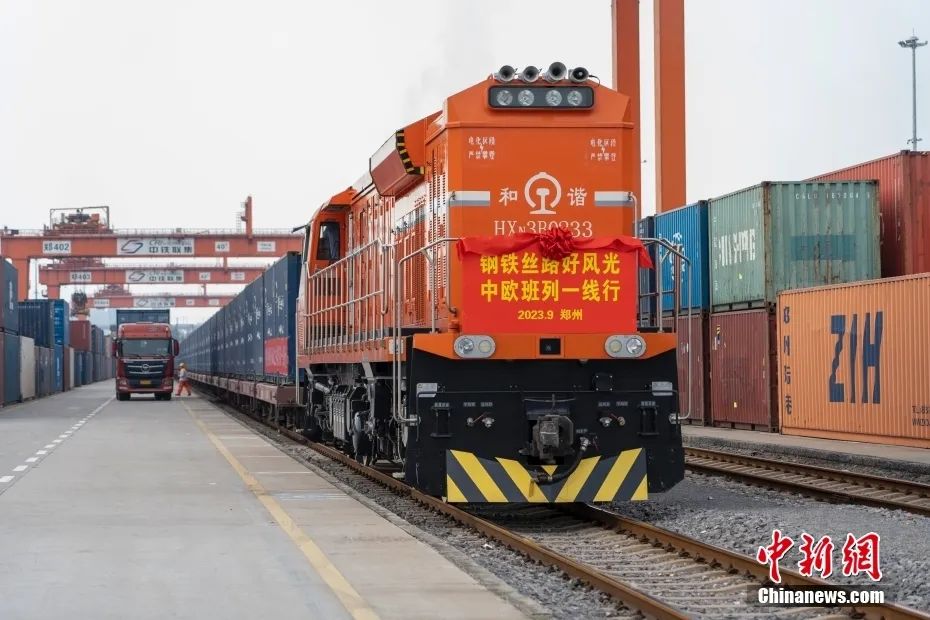 2023年9月17日,河南郑州,一列满载医疗器械、汽车配件等货物的中欧班列(郑州)从中国铁路郑州局集团有限公司圃田车站驶出,将经中国二连浩特开往德国汉堡。
