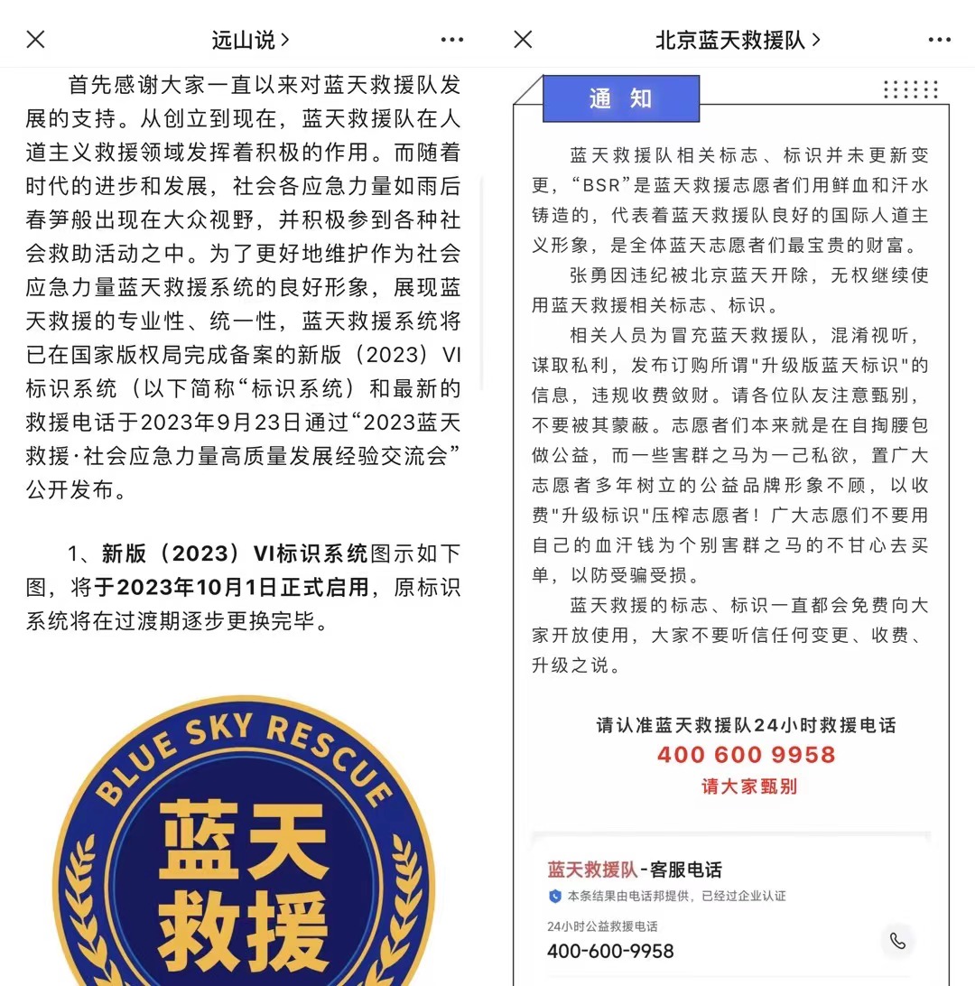 中新网注意到,今年9月30日,张勇在“远山说”公众号上发布了《蓝天救援关于更换VI标识系统、救援电话的公告》,称将于2023年10月1日正式启用。就在启用当天,北京蓝天救援队公众号发布信息称“蓝天救援队相关标志、标识并未更新变更。不要听信任何变更、收费、升级之说。”