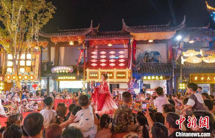 10月18日,游客在木兰不夜城观看演出。张畅 摄