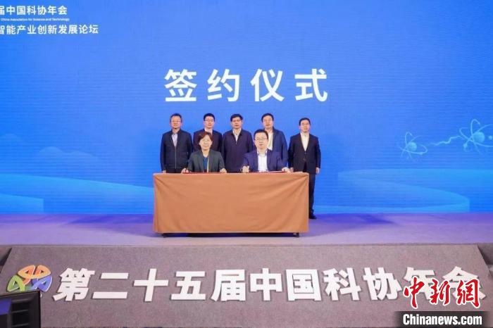 第二十五届中国科协年会通用人工智能产业创新发展论坛上,中国自动化学会与科大讯飞签署战略合作协议。中国科协 供图