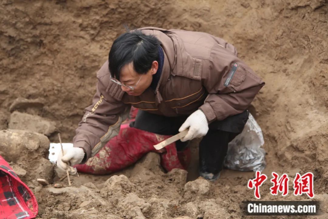 何利群在邺城遗址东郭区佛教造像埋藏坑遗迹进行现场发掘。邺城考古队供图