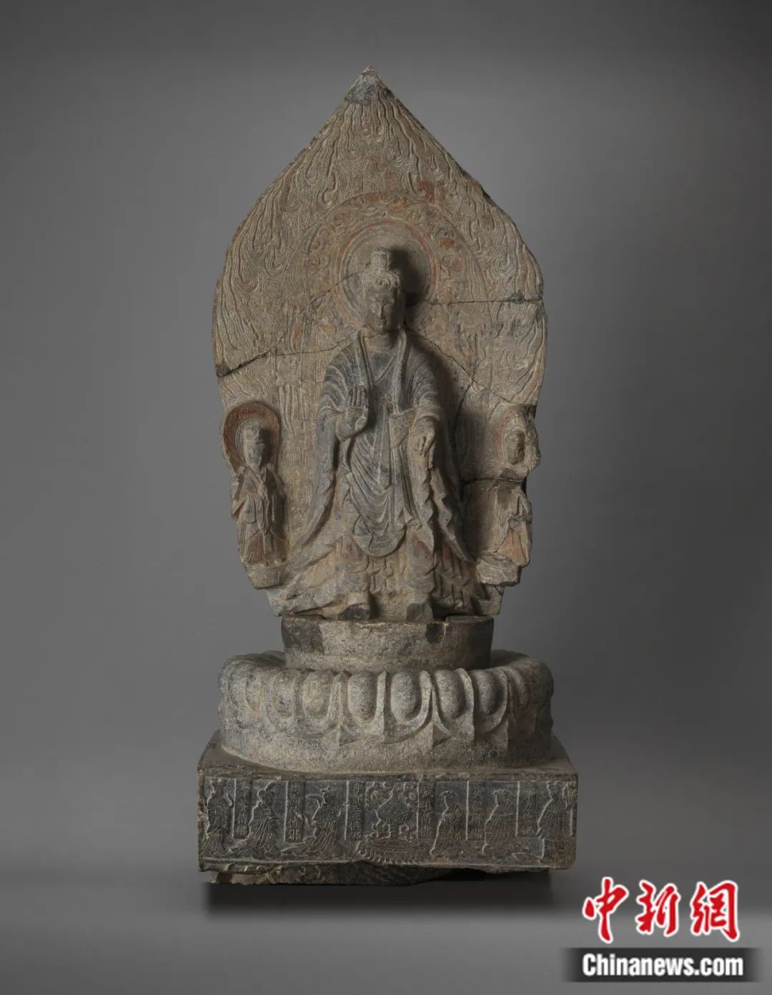 何利群:“谭副造释迦像”残高1.28米,主尊高77.7厘米,青石材质,是一尊一佛二菩萨背屏式造像,通体彩绘贴金。它由数十件碎块拼接缀合而成,是邺城地区出土时代最早的北魏造像之一,也是其中形体较大的一件。