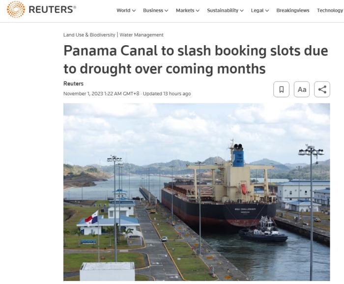 据报道,巴拿马运河管理局(ACP)在10月30日晚间的公告中表示,从11月3日开始,巴拿马运河的通行名额将从每天31个减少到每天25个,并将在未来三个月内逐步减少,计划到2024年2月减少为每天18个名额。