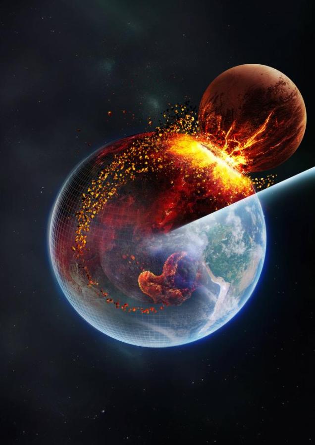 本项研究成果艺术想象图:月球形成的巨大撞击在地球内部留下了外星岩石(制图Herna n Can ellas)。施普林格·自然 供图