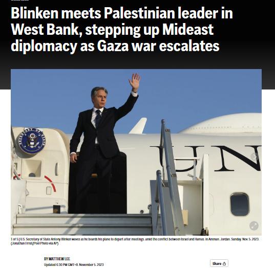 据报道,这是本轮巴以冲突爆发以来,美国最高级别外交官首次到访约旦河西岸。