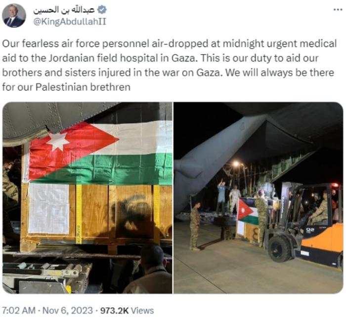 中新网11月6日电 当地时间6日,约旦国王阿卜杜拉二世在社交媒体发文称,约旦空军在6日午夜时分向加沙的约旦野战医院空投了紧急医疗援助物资。