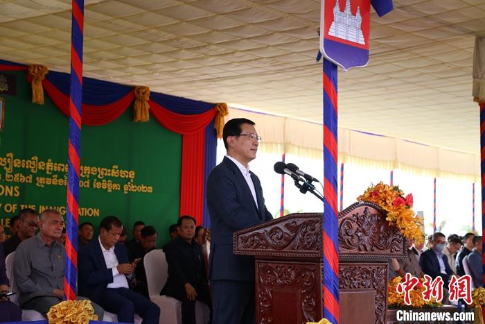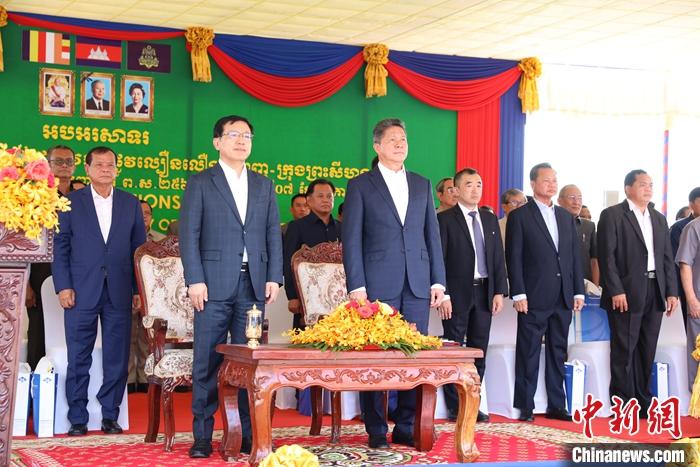 中国驻柬埔寨大使王文天、柬公共工程与运输部大臣宾波尼及超2000名企业代表和当地民众参加庆典活动。
