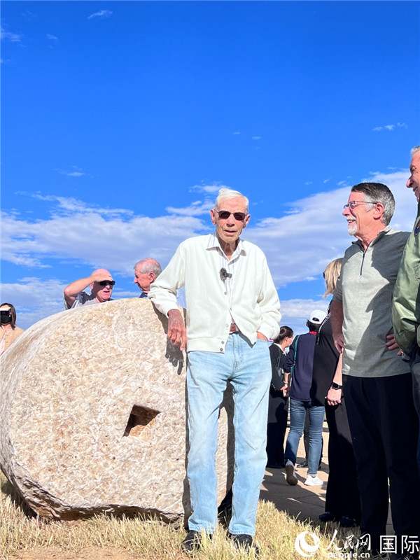 103岁的飞虎队老兵哈里·莫耶在云南昆明呈贡机场旧址的石碾前留影。人民网 赵瞳摄