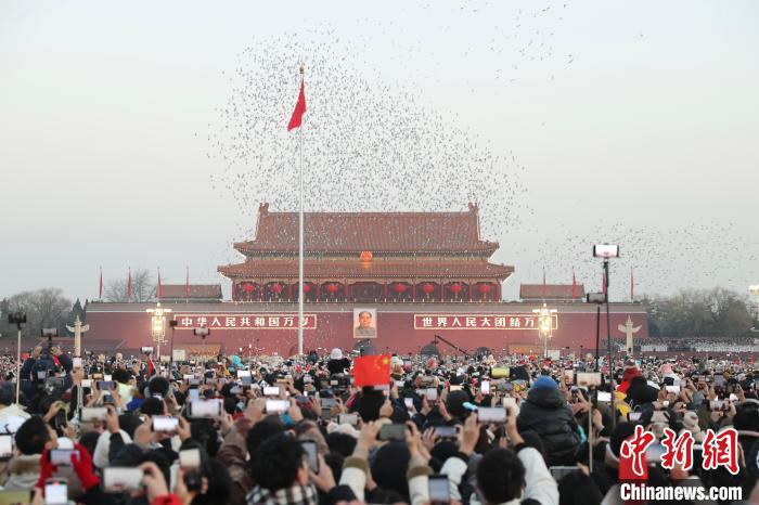 随着国旗升至旗杆顶端,万羽和平鸽腾空而起,绕着天安门广场盘旋。在《歌唱祖国》的旋律中,“新年快乐!”“我爱你,祖国!”……欢呼声和掌声此起彼伏。