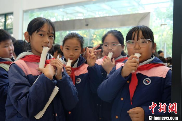近日,杨允慈(左一)和同学们一起品尝刚出炉的宁波年糕。中新社记者 林波 摄