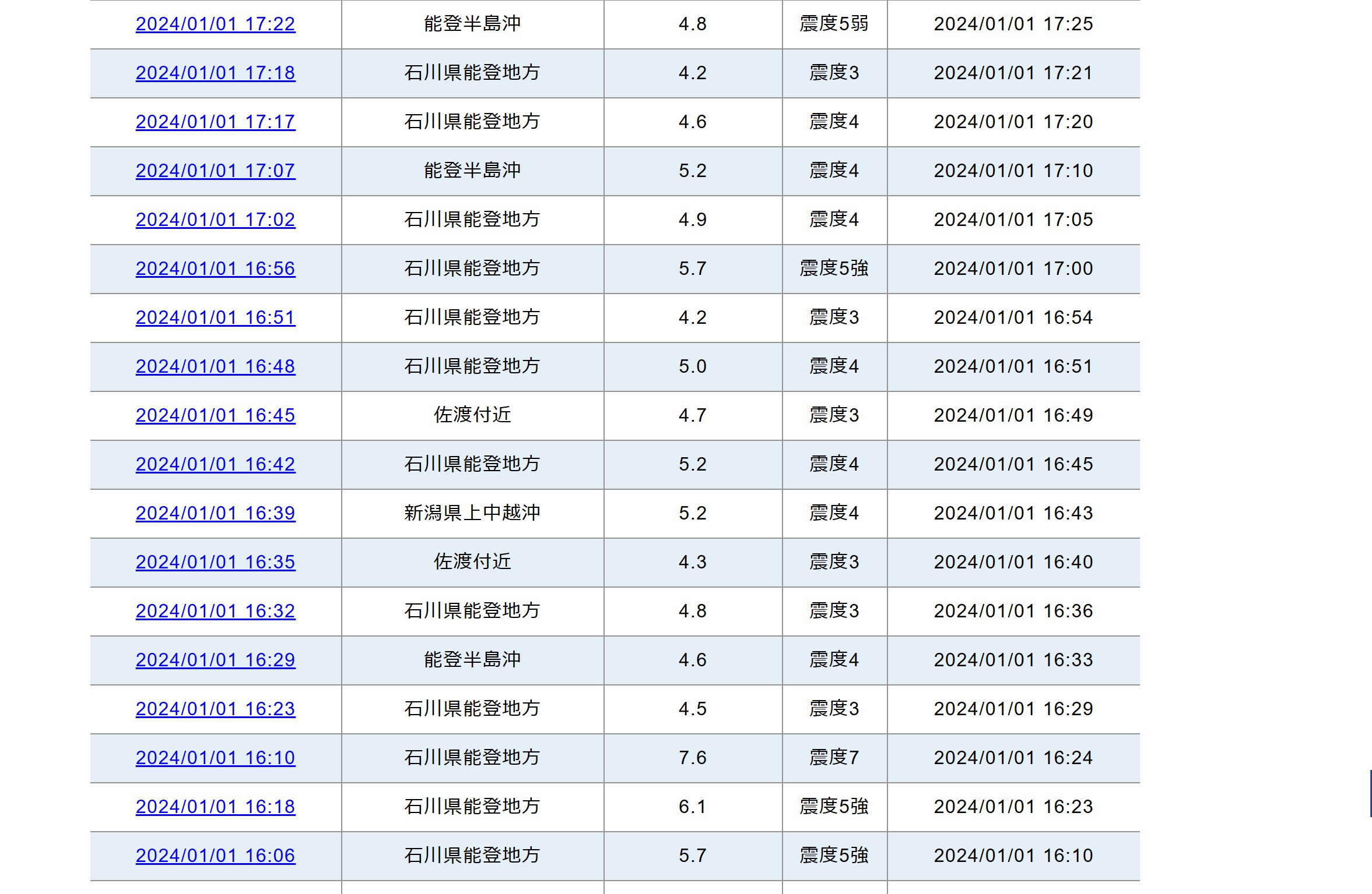 当地时间16时06分至17时22分期间,石川县能登地区附近发生至少15次地震,地震震级均在4级以上,其中至少有7次在5级以上。
