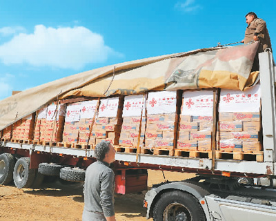 2023年11月27日,在埃及开罗,中国向加沙地带提供的人道主义物资装车等待发运。