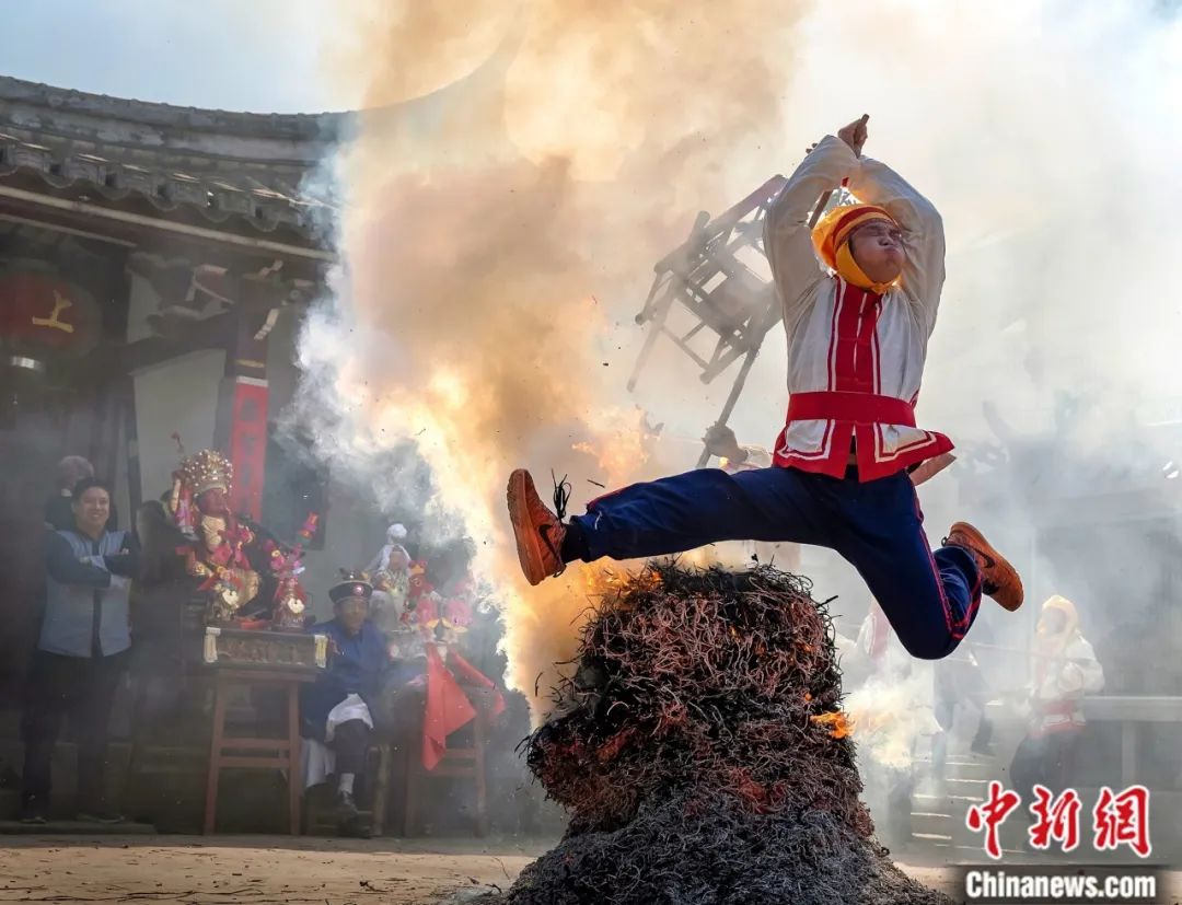 信众在莆禧古城“摆棕轿”跳火祈福。中新社记者 王东明 摄