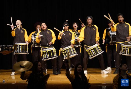 1月30日,在美国华盛顿州塔科马市林肯中学,学校鼓乐队在美国中学生赴华交流欢送仪式上表演。新华社记者 吴晓凌 摄