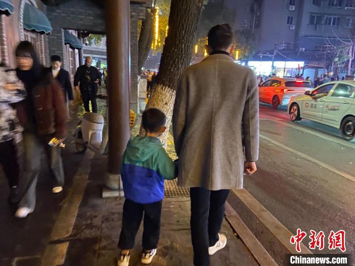 小林牵着外甥的手走在街头。 小林供图