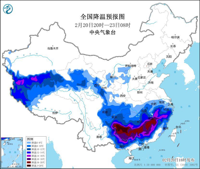 中新网2月20日电 据中央气象台网站消息,中央气象台2月20日18时继续发布寒潮橙色预警:受寒潮影响,预计,2月20日20时至2月23日,我国南方大部地区将出现降温,日平均或最低气温普遍下降8~12℃,西南地区东南部、江南大部、华南中北部等地气温下降12~18℃,其中,贵州东南部、湖南西南部、广西北部等地的部分地区累计降温幅度可达20℃以上。2月23日前后,最低温度0℃线将南压到苏皖南部至湖南南部、贵州南部一带。