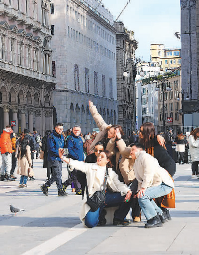 意大利米兰市中心,中外游客在景点前摆造型拍合影。