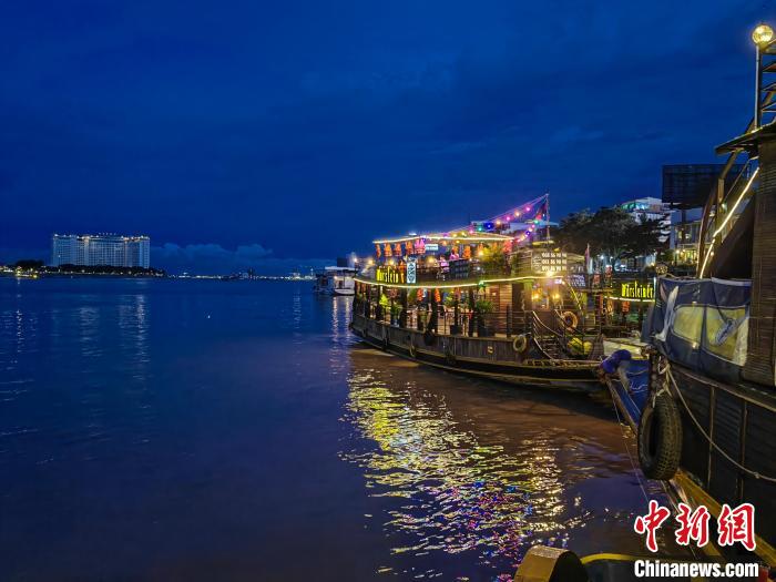 游轮成为夜幕下金边湄公河面一道亮丽的风景(资料图)。中新社记者 杨强 摄