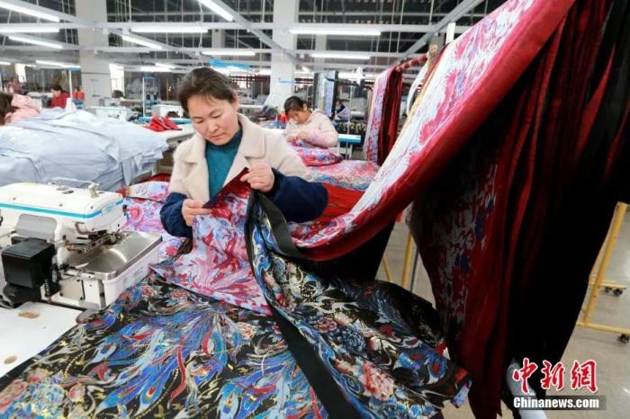 工人将剪裁好的布料进行拼接缝制。梁犇 摄