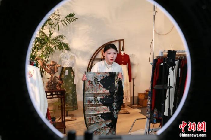 主播正在直播间销售马面裙。梁犇 摄