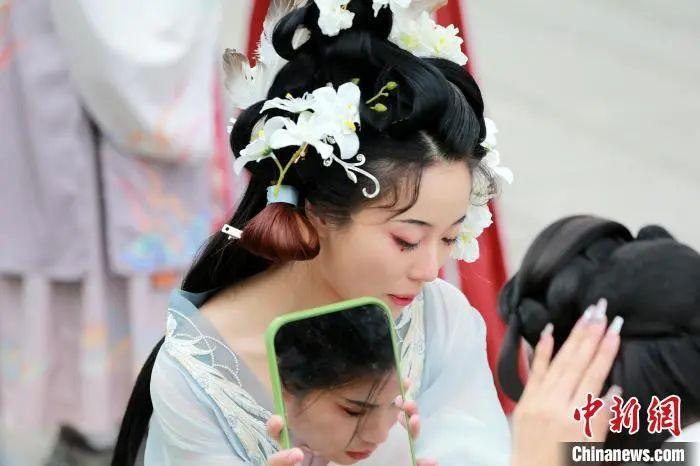 民众着华服整理发饰。梁犇 摄